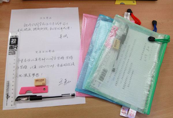 200多份爱心文具袋,包含一支黑色签字笔、一把小刀、一块橡皮、一把直尺、一封《致10级考生的信》及学院院长姜斌教授和党委书记王勤教授亲笔撰写的深情寄语,内容不多但心意满满。